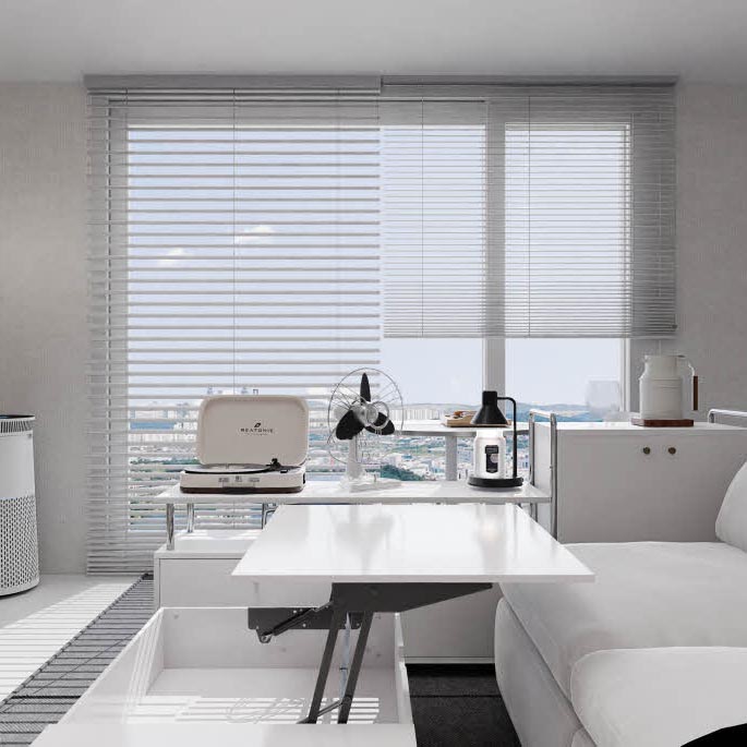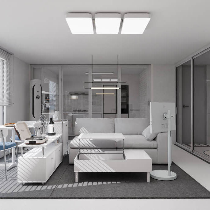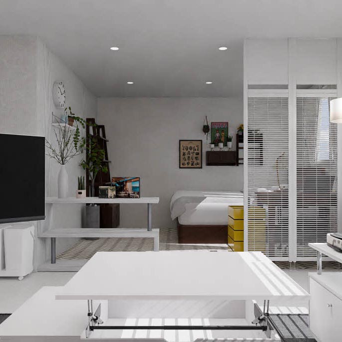 거실은 방, 주방이 하나로 연결된 원룸 형태로 구성했습니다. 친구, 가족, 직장 동료 누구든 자연스럽게 대접할 수 있는 카페 같은 분위기를 연출하며 이동식 스마트 TV를 배치해 어디서든 편안하게 OTT 콘텐츠를 즐길 수 있도록 했습니다.