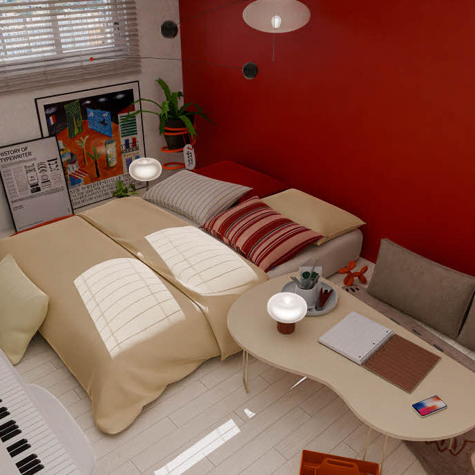 침실은 따뜻한 레드와 라이트 옐로우 컬러를 중심으로 에너지를 충전하고 힐링할 수 있는 공간으로 디자인했습니다. 매트리스형 침대와 좌식형 책상을 배치해 공간이 답답해 보이지 않도록 했고, 하루를 마무리하며 일기를 작성할 수 있는 안락한 공간도 마련했습니다. 애정이 담긴 소품과 액자들로 소소하게 포인트를 주었습니다.