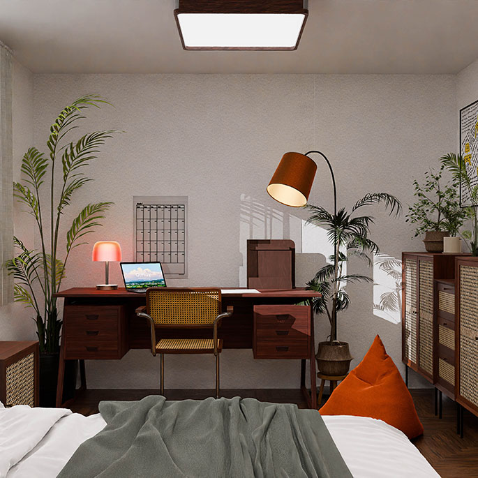 방 1은 다크브라운과 그린 컬러가 돋보이는 편안한 분위기의 공간으로, 작업과 휴식을 모두 아우를 수 있는 다목적 공간으로 디자인했습니다. 이 방에서는 집중하여 일하거나 편안하게 휴식을 취할 수 있습니다.