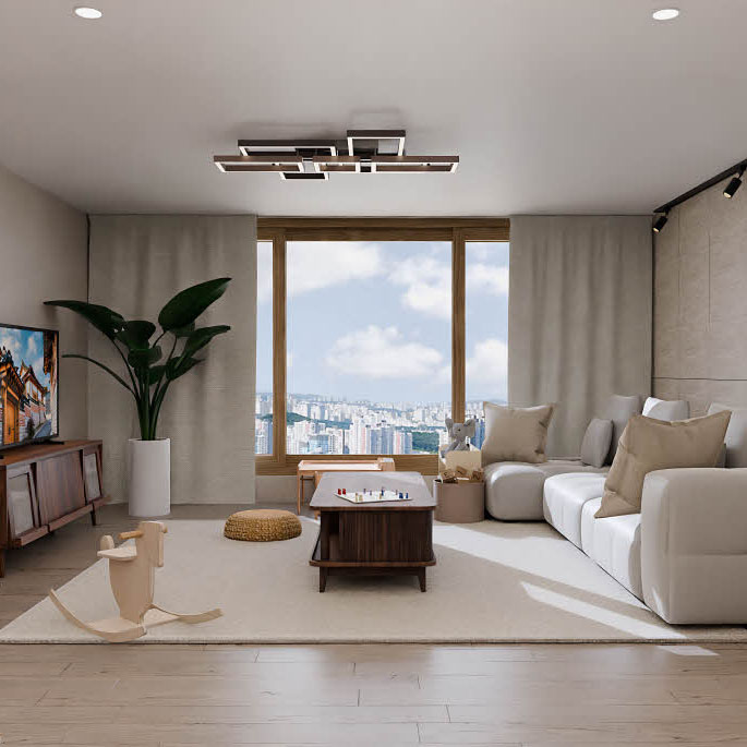 거실은 가족들이 함께 즐길 수 있는 유희거리가 가득한 놀이터입니다. 보드게임, TV(게임기, 영화 감상 등), 그리고 막내를 위한 놀이 책상이 마련되어 있어, 사춘기가 될 아이들이 각자 방에 틀어박히지 않고 거실에서 가족과 함께 시간을 보내길 바라는 저의 소망을 담았습니다.