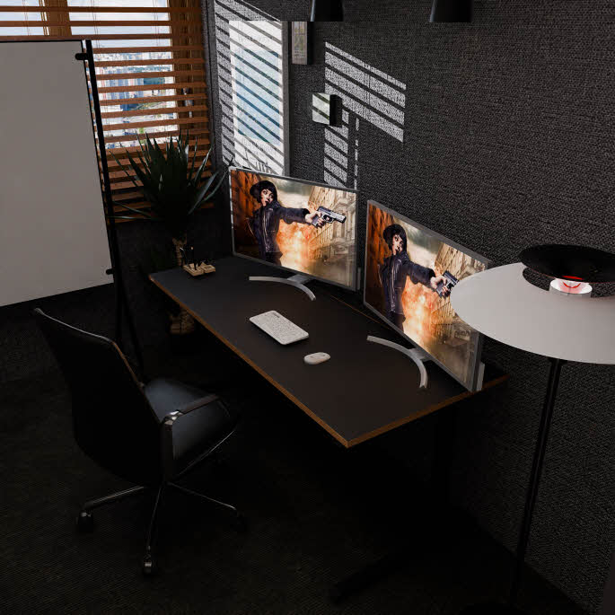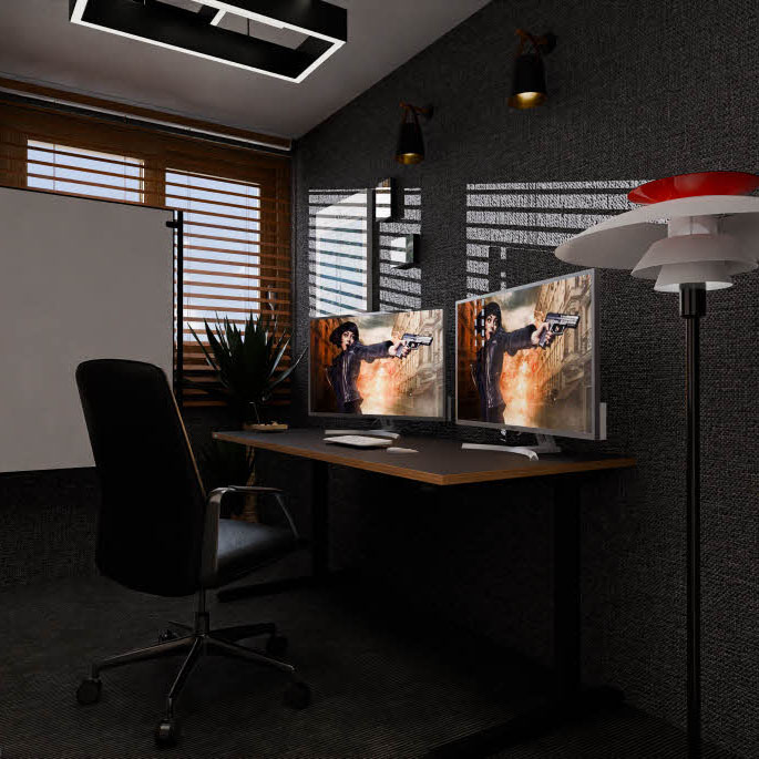 안방 내 알파룸은 재택근무용 사무실로, 시크한 블랙으로 오직 모니터만 돋보이게 연출했습니다. 디자인 업무를 하고 있어, 집중할 수 있는 환경을 만들었습니다.