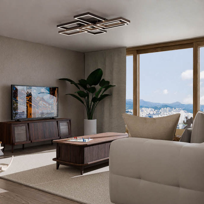 자녀방 이외의 공간 디자인은 현재 거주하고 있는 집과 비슷한 점이 많습니다. 짙은 원목 가구와 패브릭 소파, 각자 침대를 사용하는 부부의 생활 스타일을 반영했으며, 넓어진 공간을 활용해 부부 각자의 침대에 충분히 간격을 두고 배치하고, 재택근무용 미니 사무실을 마련했습니다. 안방 베란다를 활용한 부부 휴식처도 이번에 새롭게 추가된 요소입니다.