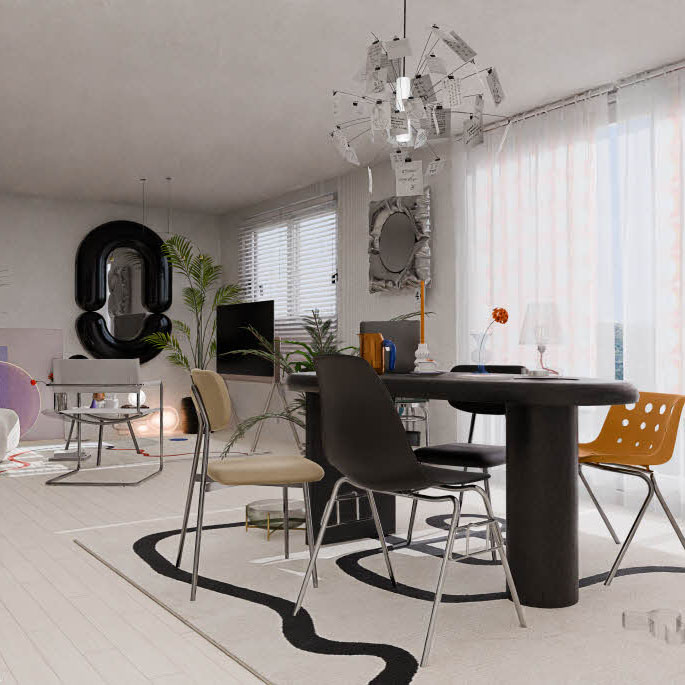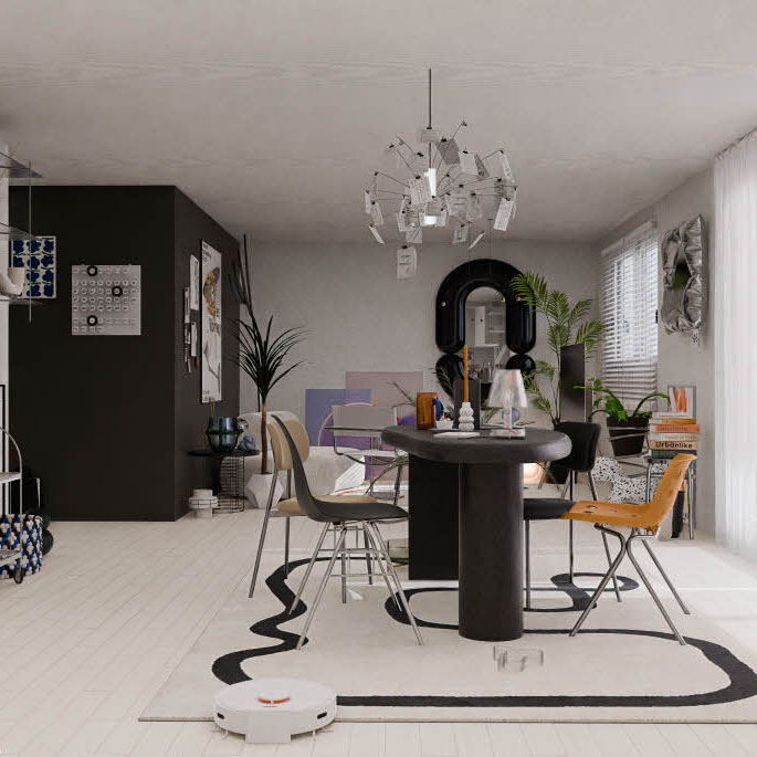 거실은 모던한 블랙을 바탕으로 볼드한 느낌의 가구와 소품들을 믹스 매치해 시각적으로 흥미로운 공간으로 꾸몄습니다. 큼직한 다이닝 테이블은 개인의 일터와 식사 공간을 동시에 제공하며, 친구와 가족이 방문했을 때 함께 시간을 보낼 수 있는 소셜 허브 역할도 합니다. 거실 중앙에는 지금까지 받은 의미 있는 편지나 쪽지들, 그리고 나에게 영감을 준 문구들을 컬렉션으로 만든 특별한 조명이 있어 공간에 특별한 의미를 더했습니다.