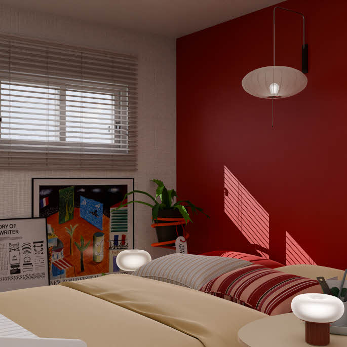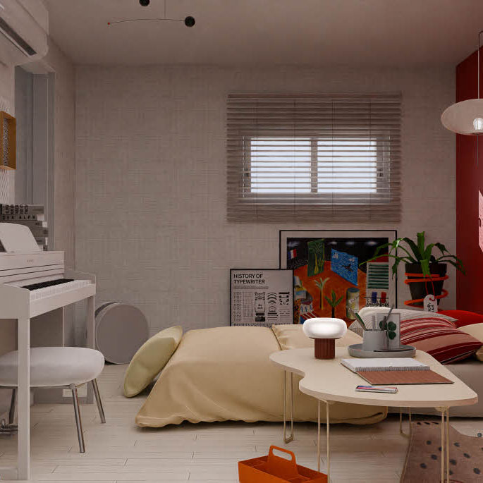침실은 따뜻한 레드와 라이트 옐로우 컬러를 중심으로 에너지를 충전하고 힐링할 수 있는 공간으로 디자인했습니다. 매트리스형 침대와 좌식형 책상을 배치해 공간이 답답해 보이지 않도록 했고, 하루를 마무리하며 일기를 작성할 수 있는 안락한 공간도 마련했습니다. 애정이 담긴 소품과 액자들로 소소하게 포인트를 주었습니다.