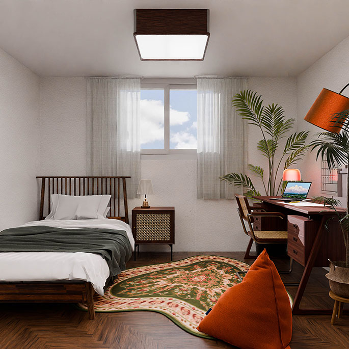 거실은 취미와 일상을 공유할 수 있는 공간이자 편안한 소통과 휴식을 위한 공간으로 꾸몄습니다. 이곳에서 가족이나 룸메이트와 함께 시간을 보내며 즐거운 추억을 쌓을 수 있도록 디자인했습니다.