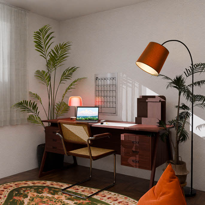 방 1은 다크브라운과 그린 컬러가 돋보이는 편안한 분위기의 공간으로, 작업과 휴식을 모두 아우를 수 있는 다목적 공간으로 디자인했습니다. 이 방에서는 집중하여 일하거나 편안하게 휴식을 취할 수 있습니다.
