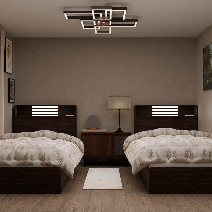 자녀방 이외의 공간 디자인은 현재 거주하고 있는 집과 비슷한 점이 많습니다. 짙은 원목 가구와 패브릭 소파, 각자 침대를 사용하는 부부의 생활 스타일을 반영했으며, 넓어진 공간을 활용해 부부 각자의 침대에 충분히 간격을 두고 배치하고, 재택근무용 미니 사무실을 마련했습니다. 안방 베란다를 활용한 부부 휴식처도 이번에 새롭게 추가된 요소입니다.